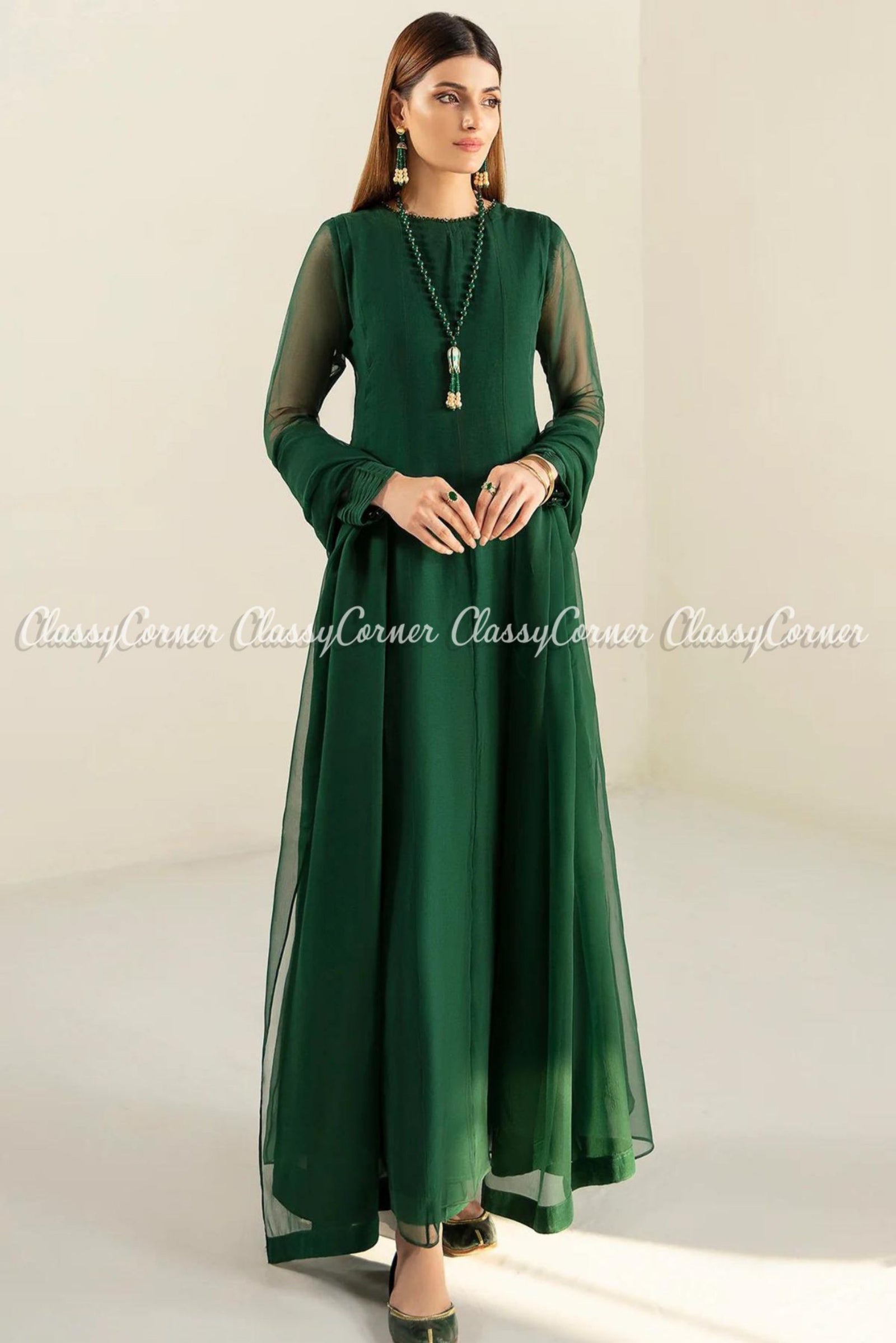 Green Plain Chiffon Pakistani Frock Maxi Dress