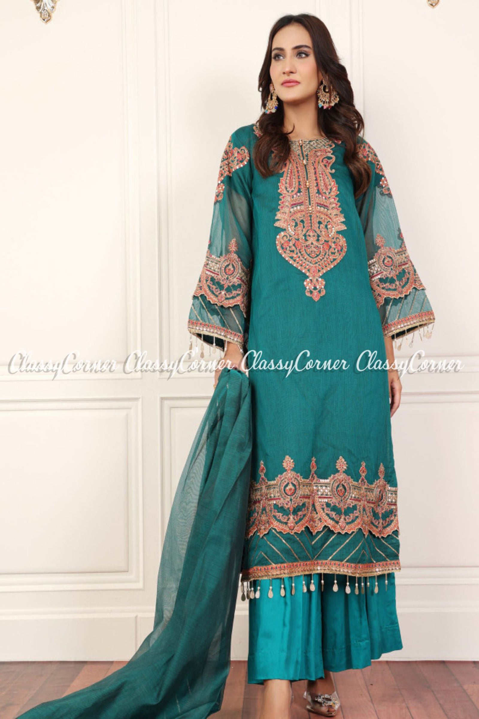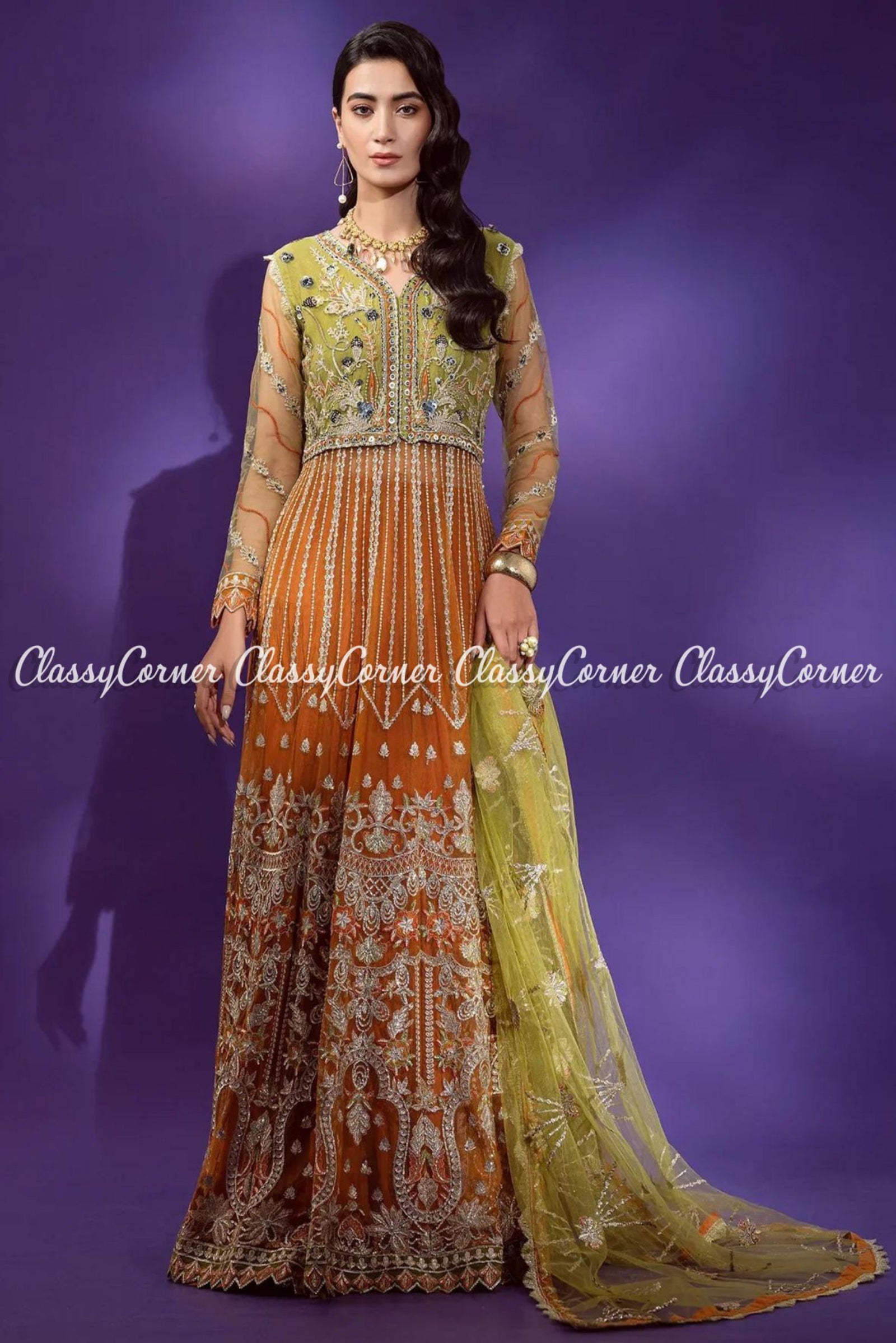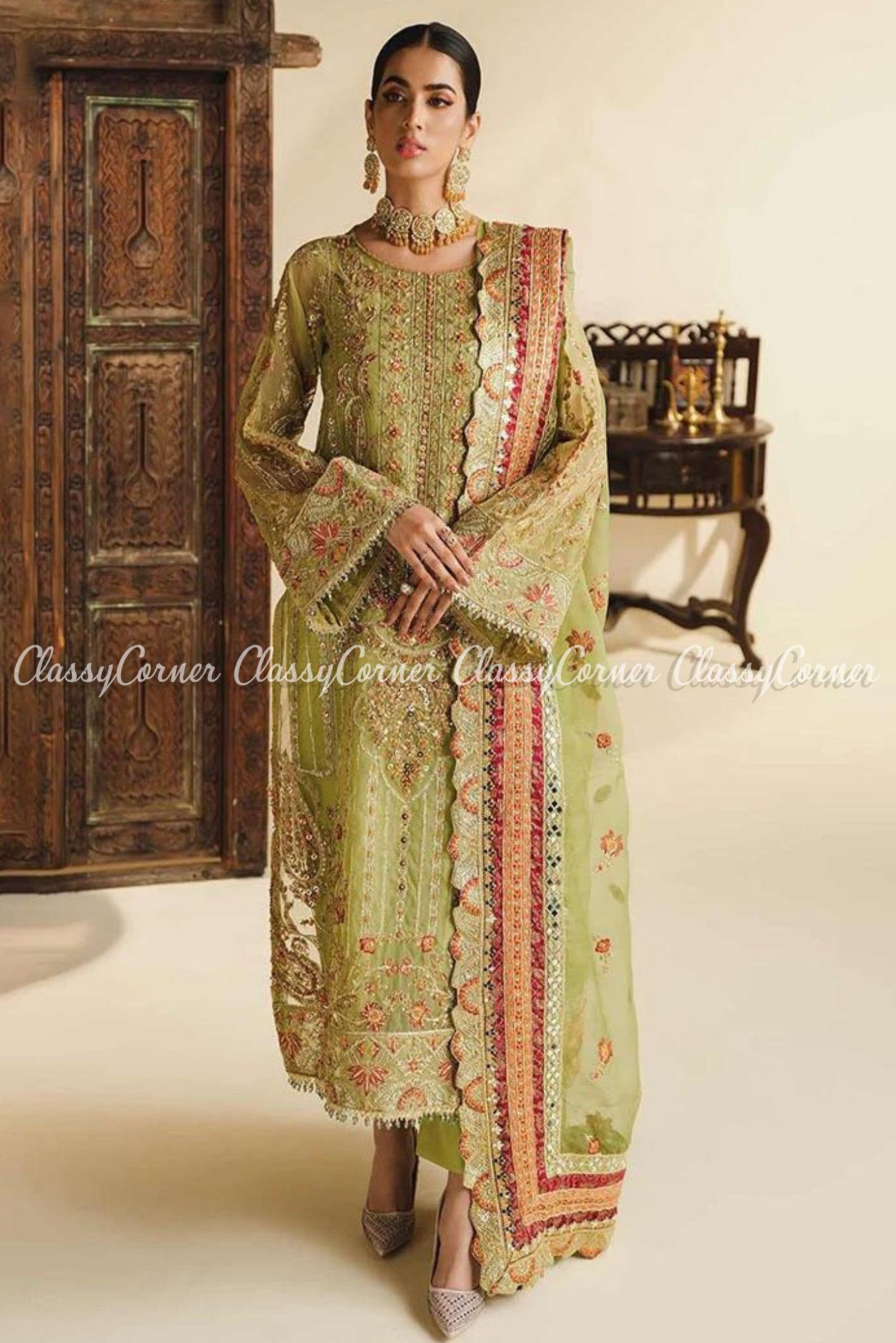 Green Orange Organza Embellished Wedding Wear Salwar Kameez