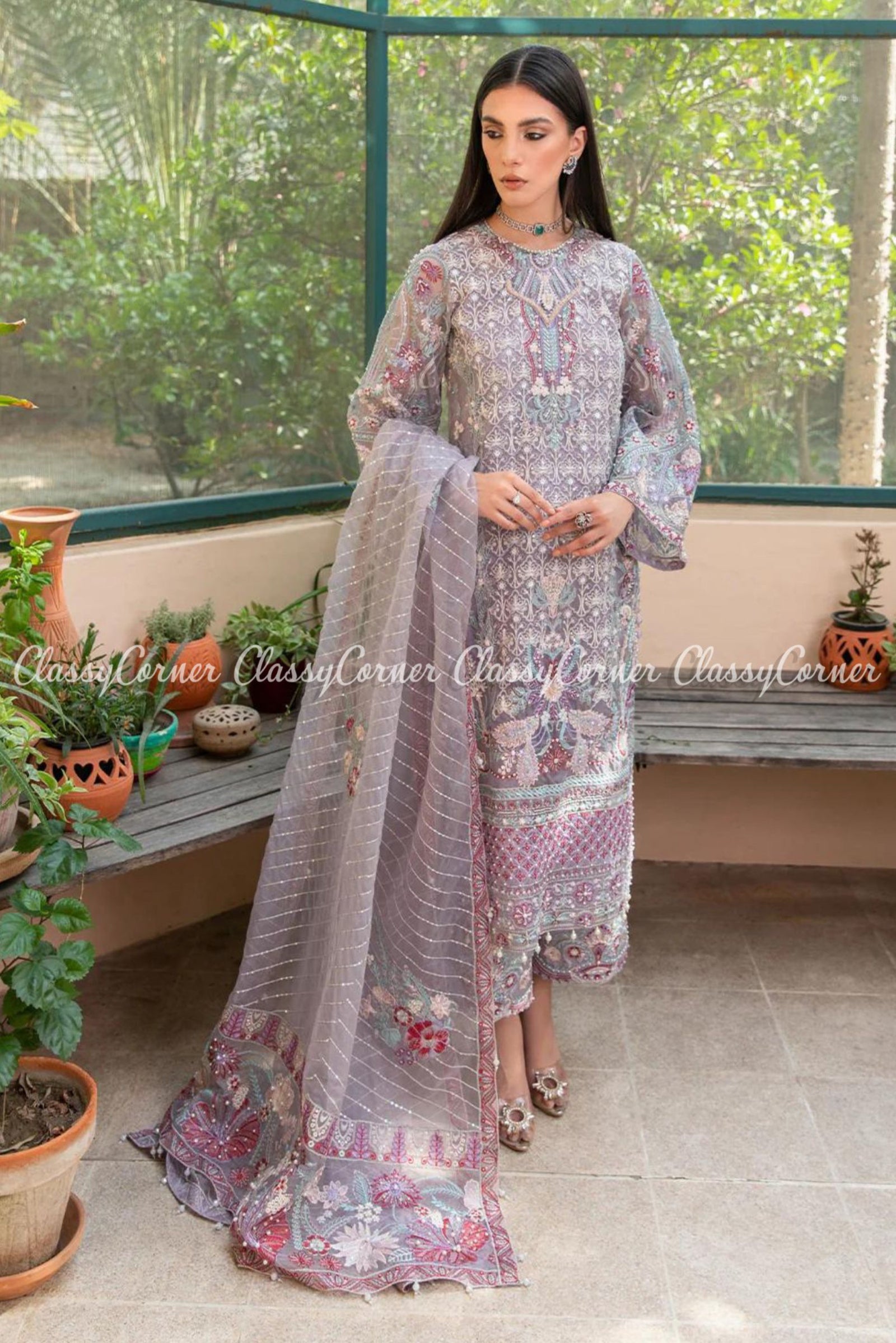$169.99 AUD $209.99 AUDLavender Blue Organza Embroidered Party Wear Salwar Kameez