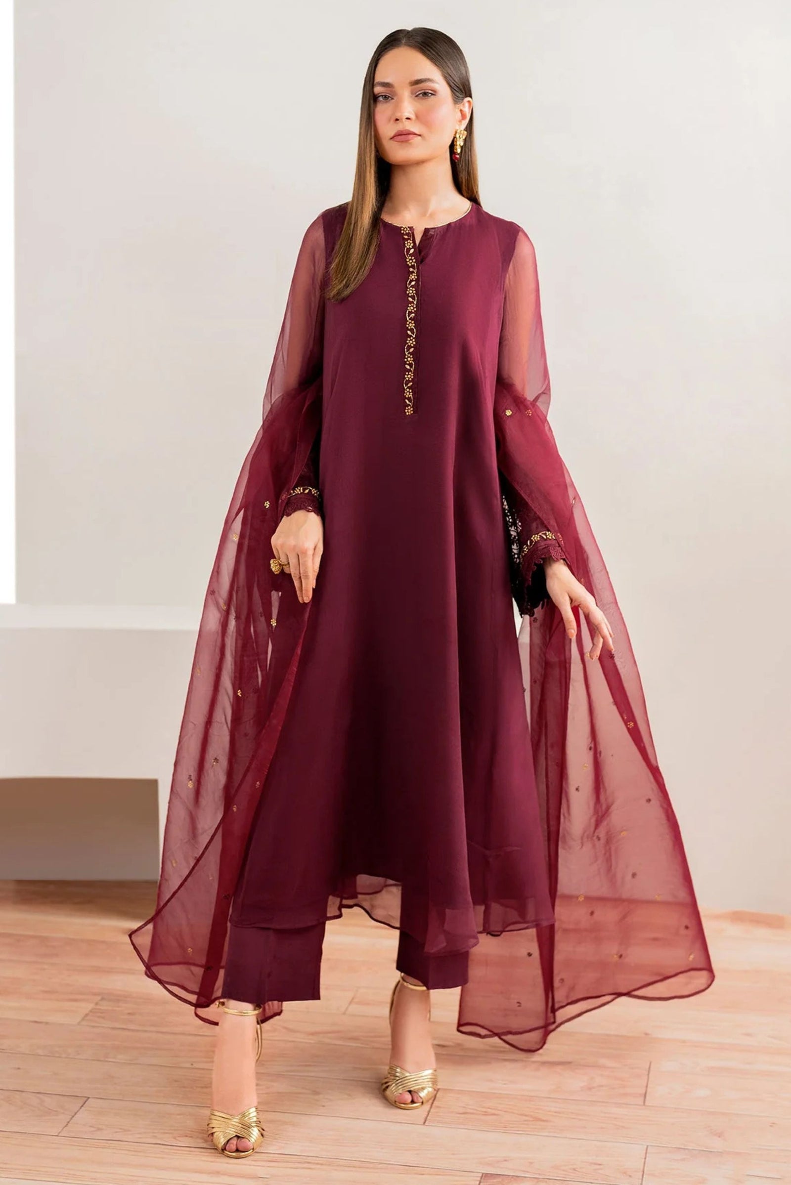 Sold OutMaroon Golden Organza Embroidered Party Wear Outfit