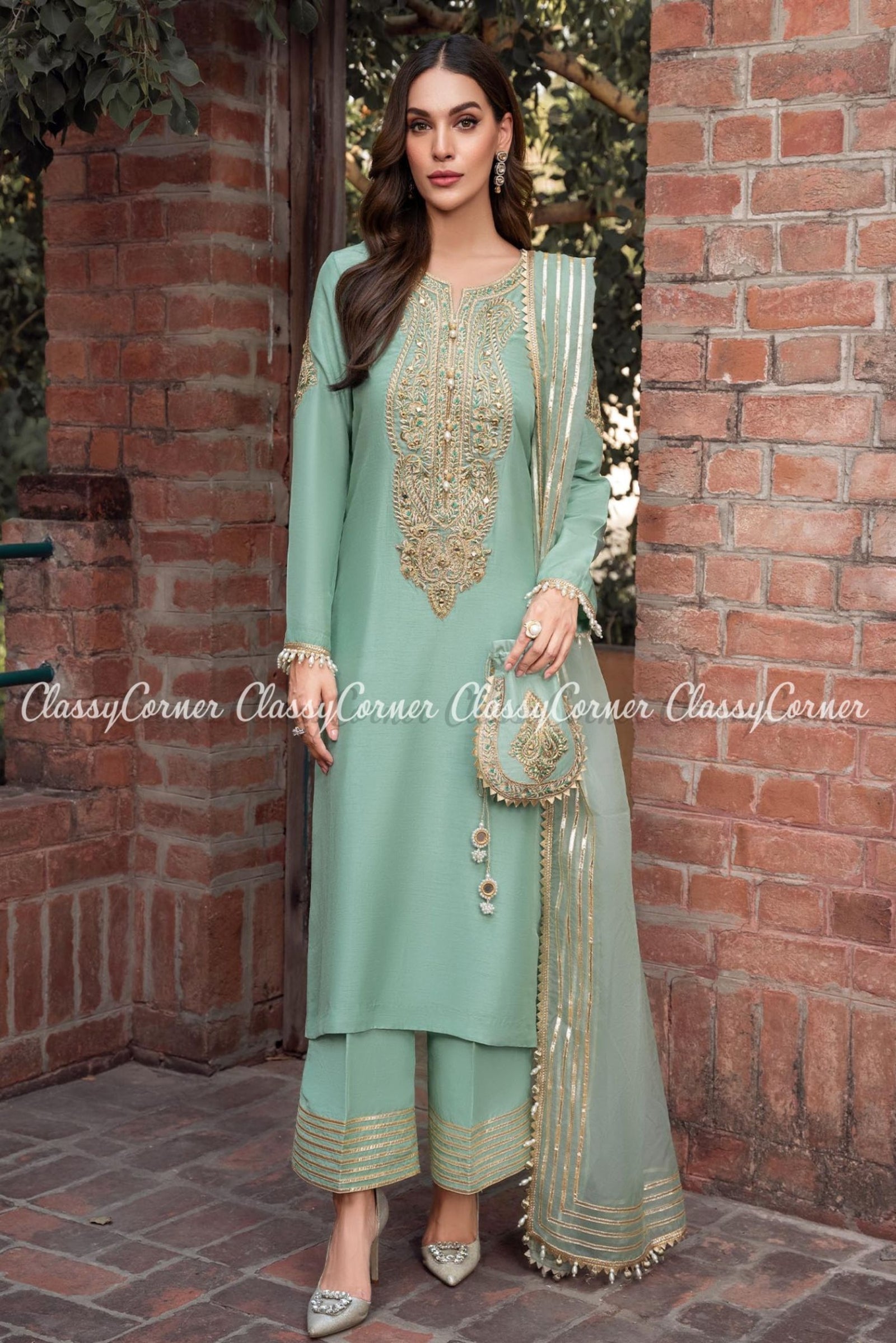 $79.99 AUDPastel Green Khaddi Silk Party Wear Outfit