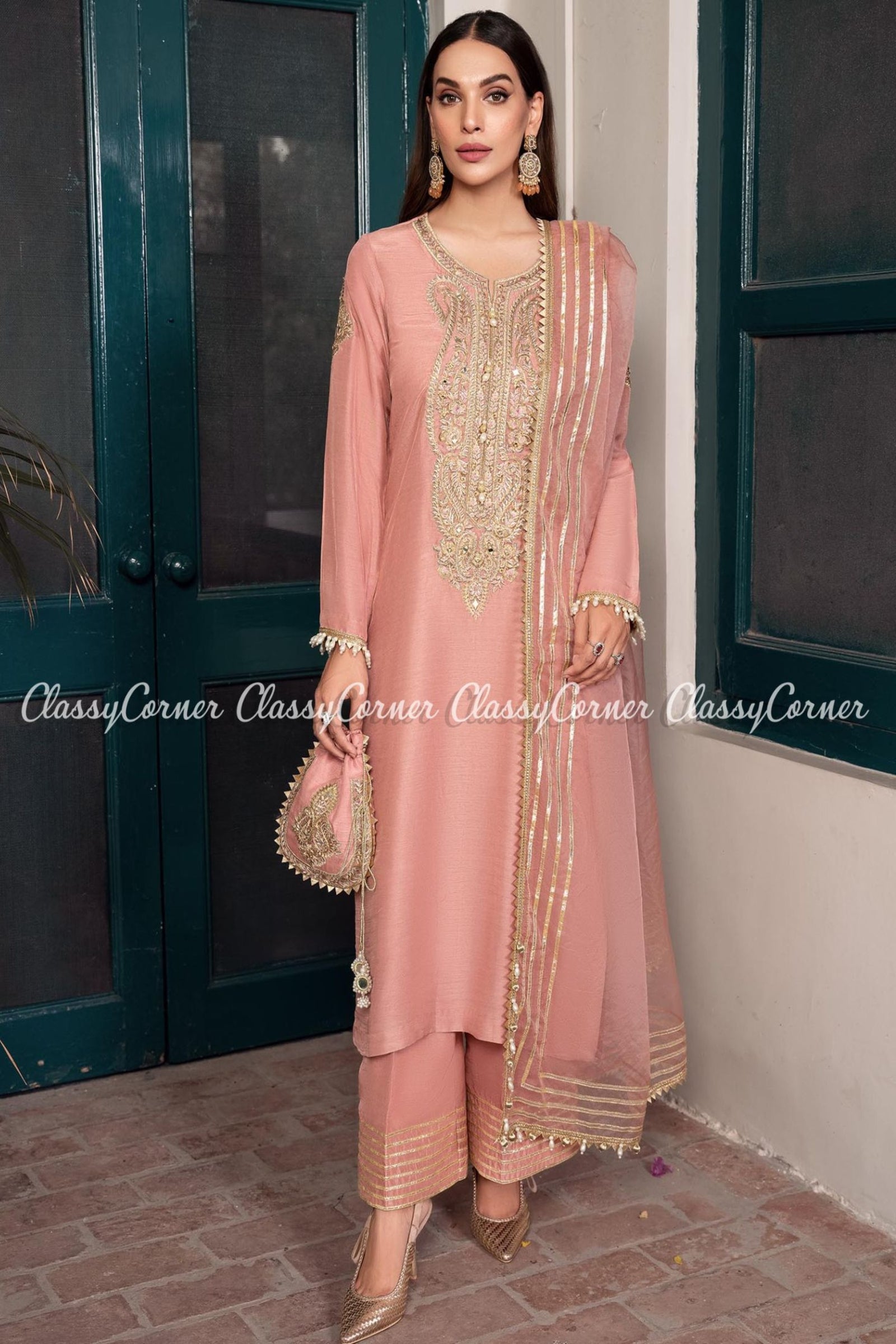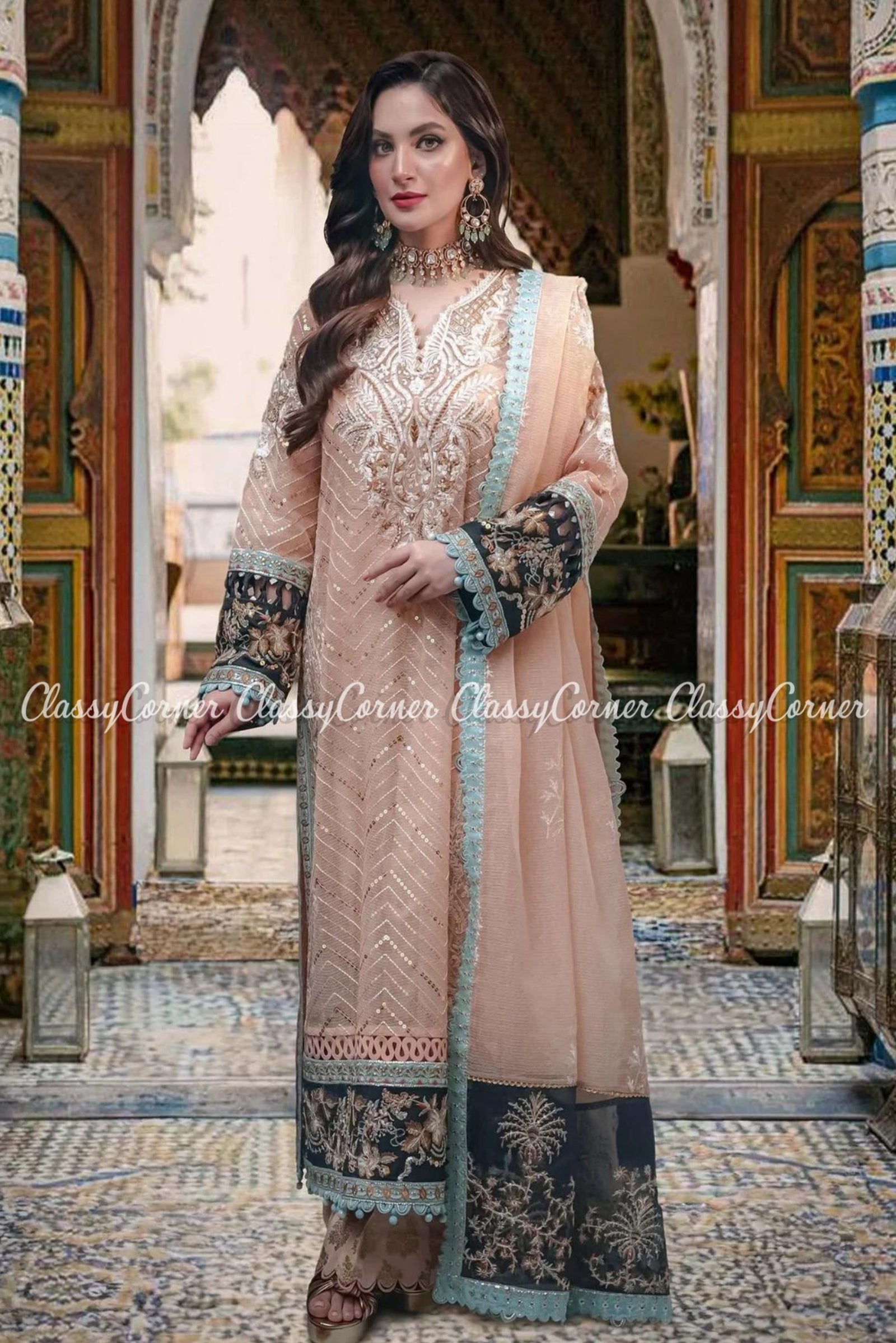 $184.99 AUD $259.99 AUDPeach Net Embroidered Formal Wear Salwar Kameez Outfit