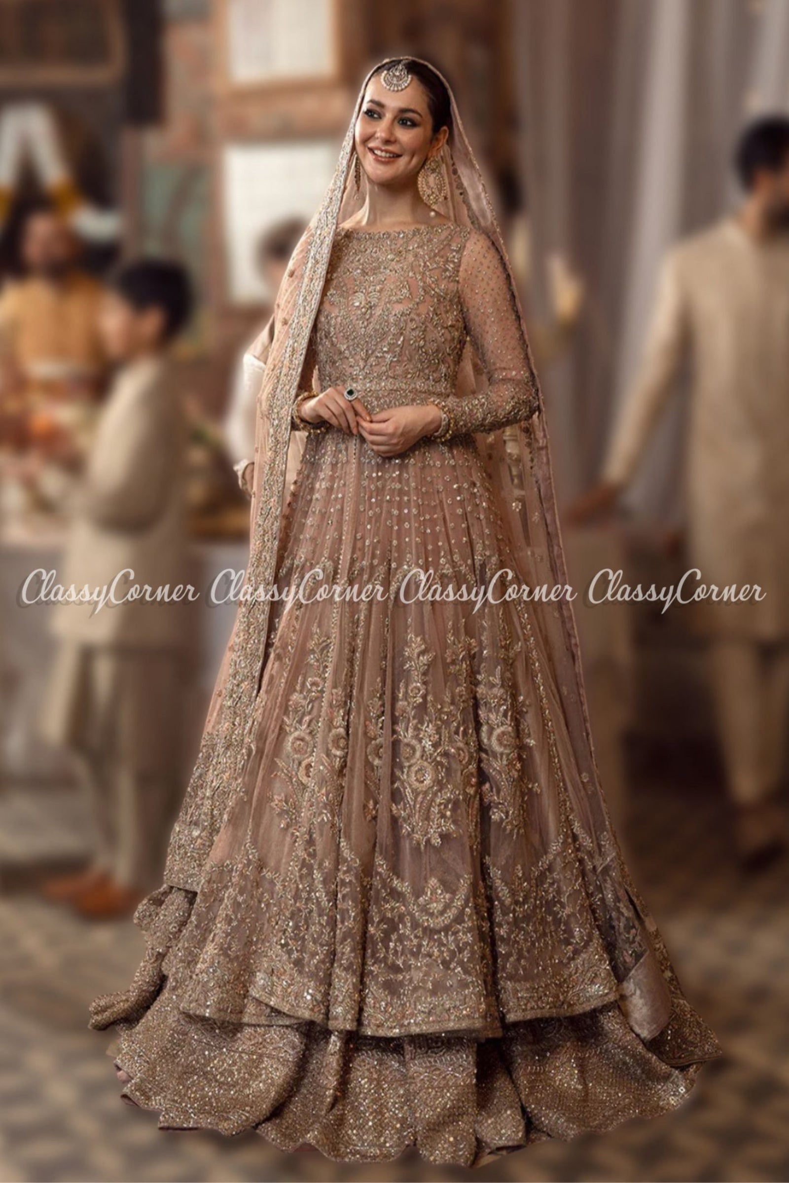 $704.99 AUD $989.99 AUDPeach Pink Golden Net Embellished Bridal Wear Gown