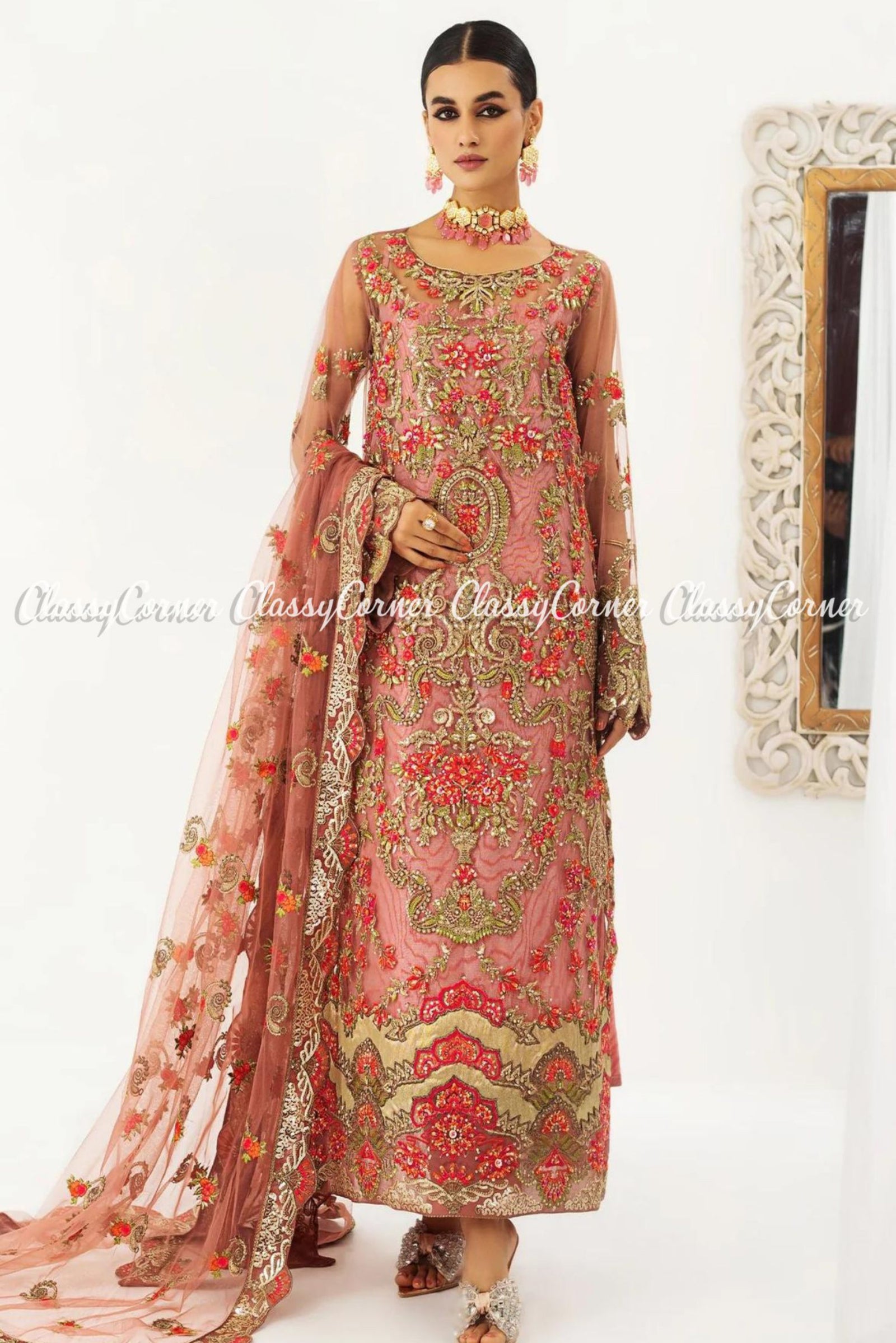 Peach Red Net Embroidered Pakistani Salwar kameez