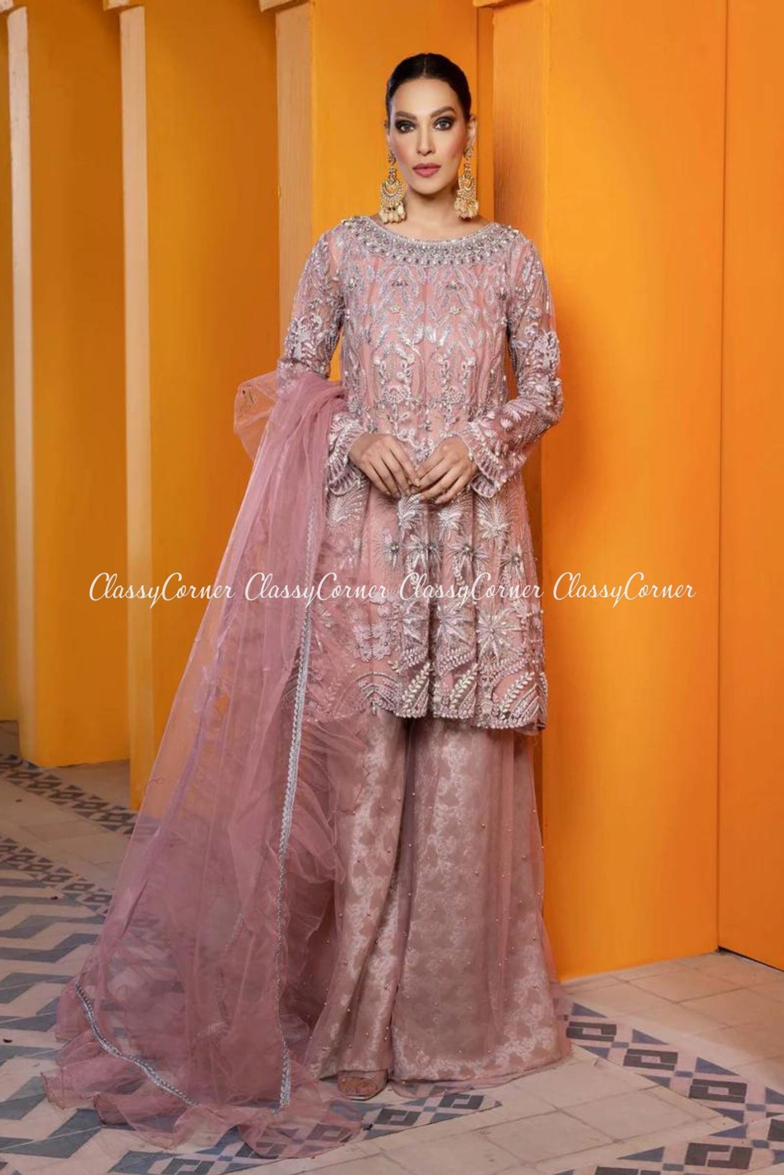 Pink Net Embroidered Formal Sharara