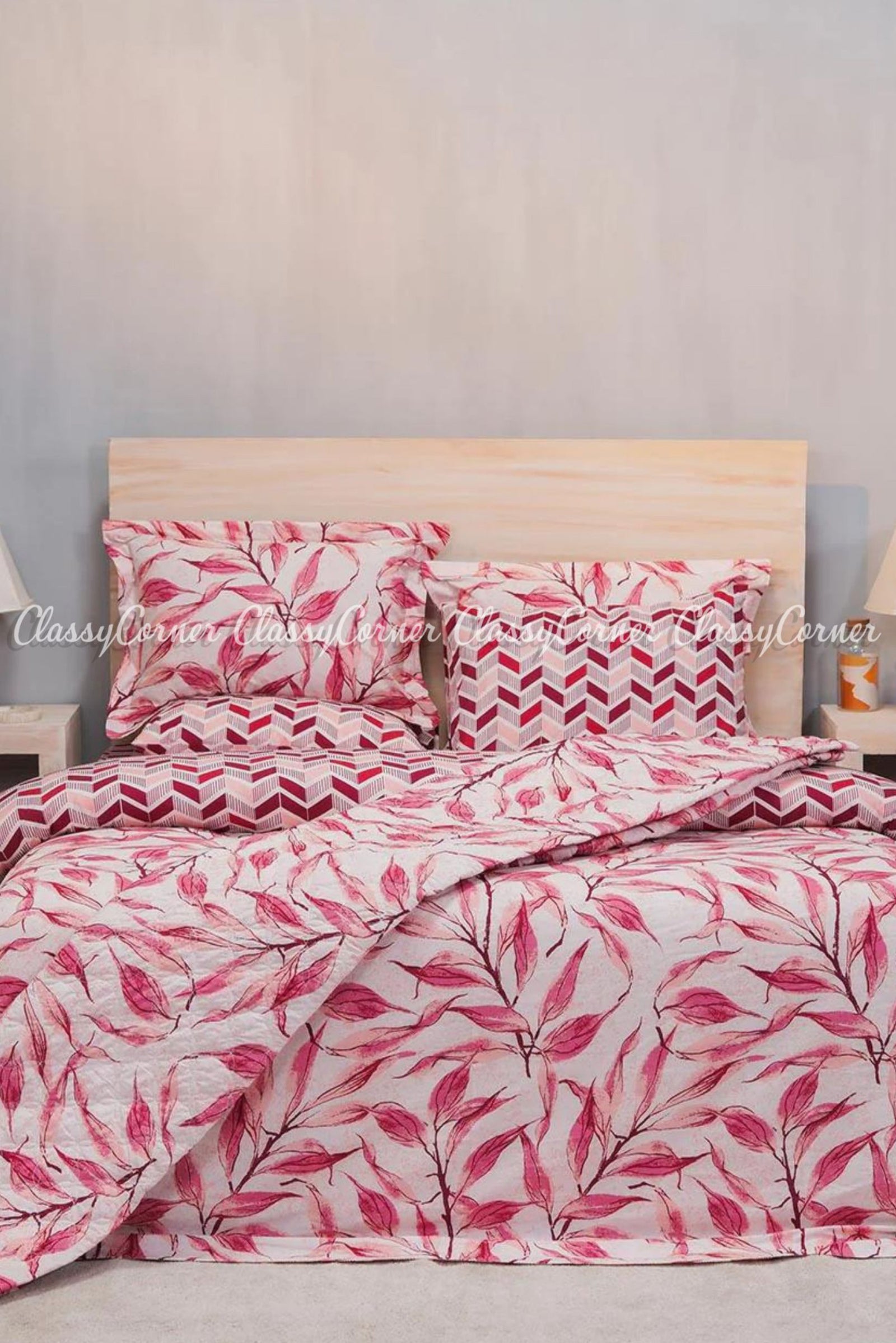 Pink Grey Geometric Floral Print Cotton Bedset