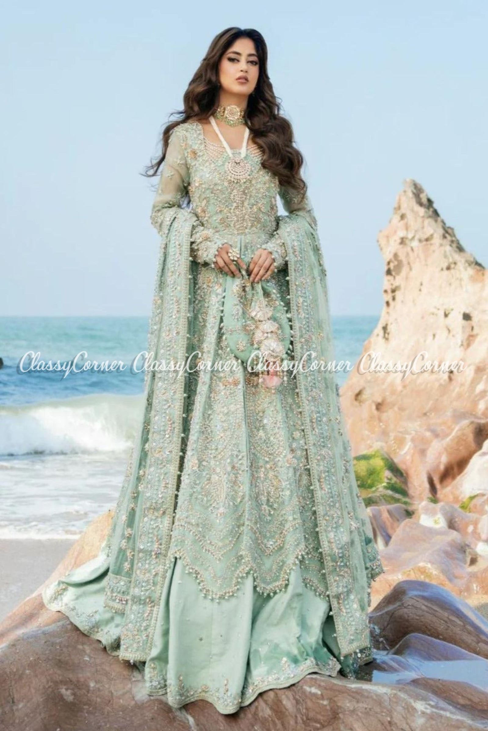 $2,299.99 AUDMint Green Organza Embellished Bridal Wear Gown Lehenga