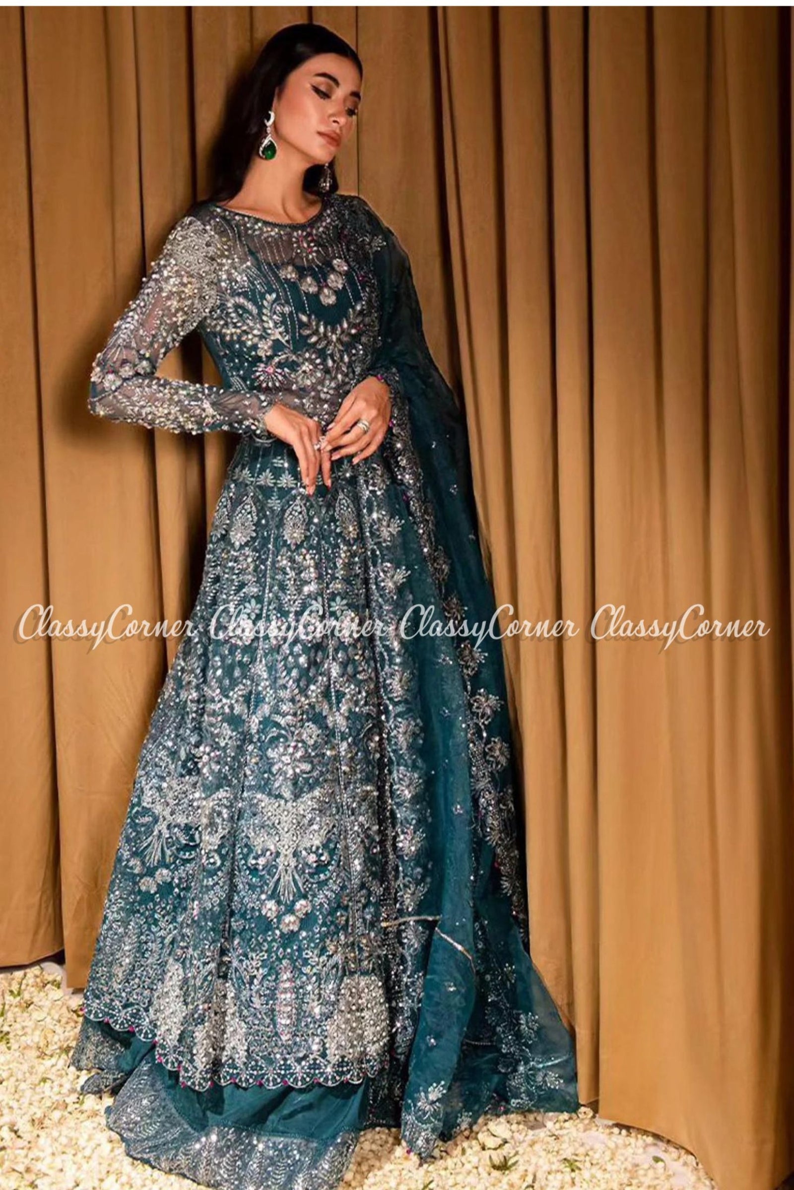 $354.99 AUD $659.99 AUDTeal Green Organza Embroidered Bridal Wear Lehenga Outfit