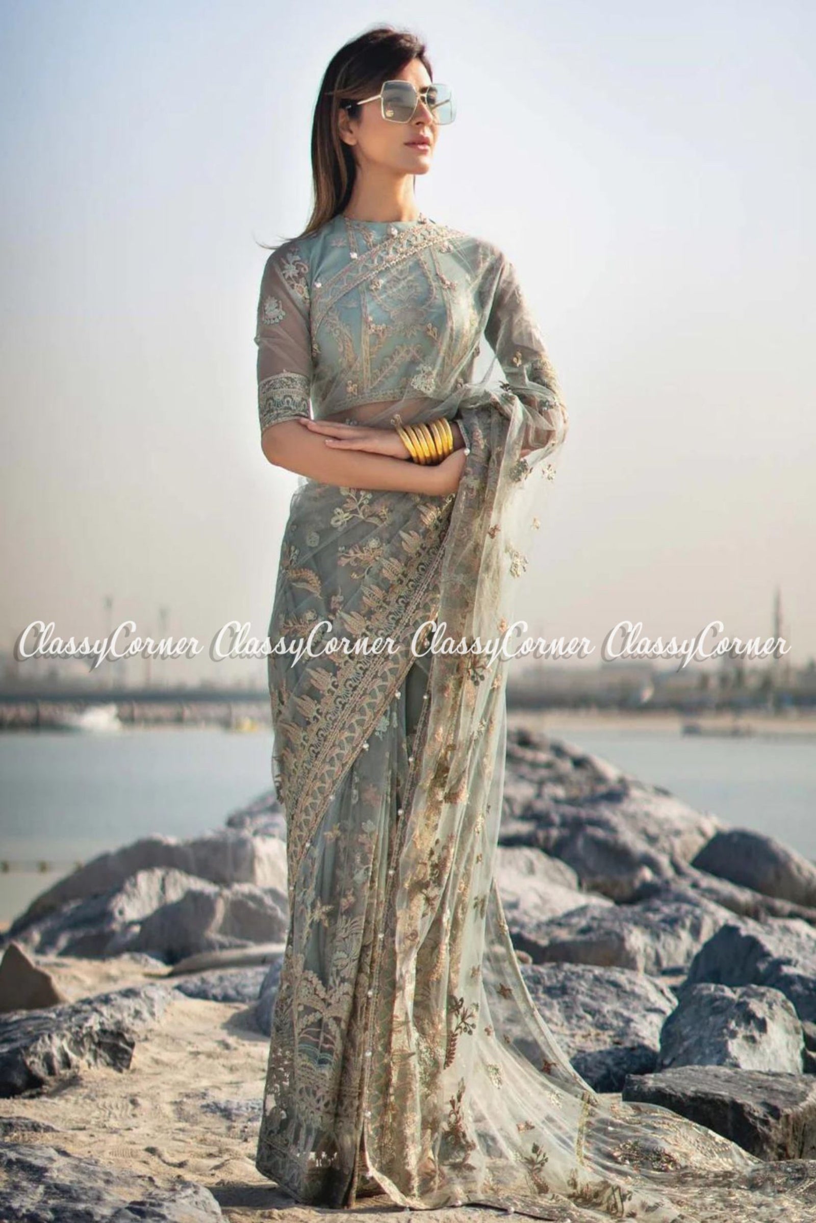 $629.99 AUDPakistani Grey Pink Net Embellished Party Wear Saree