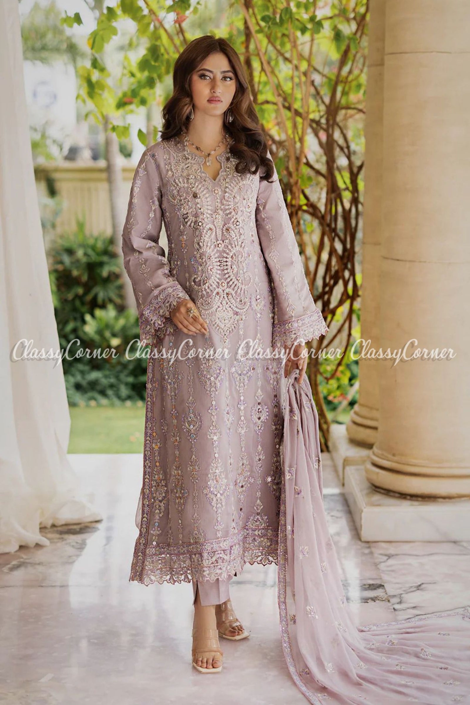 $349.99 AUDLilac Chiffon Hand Embroidered Wedding Wear Salwar Kameez