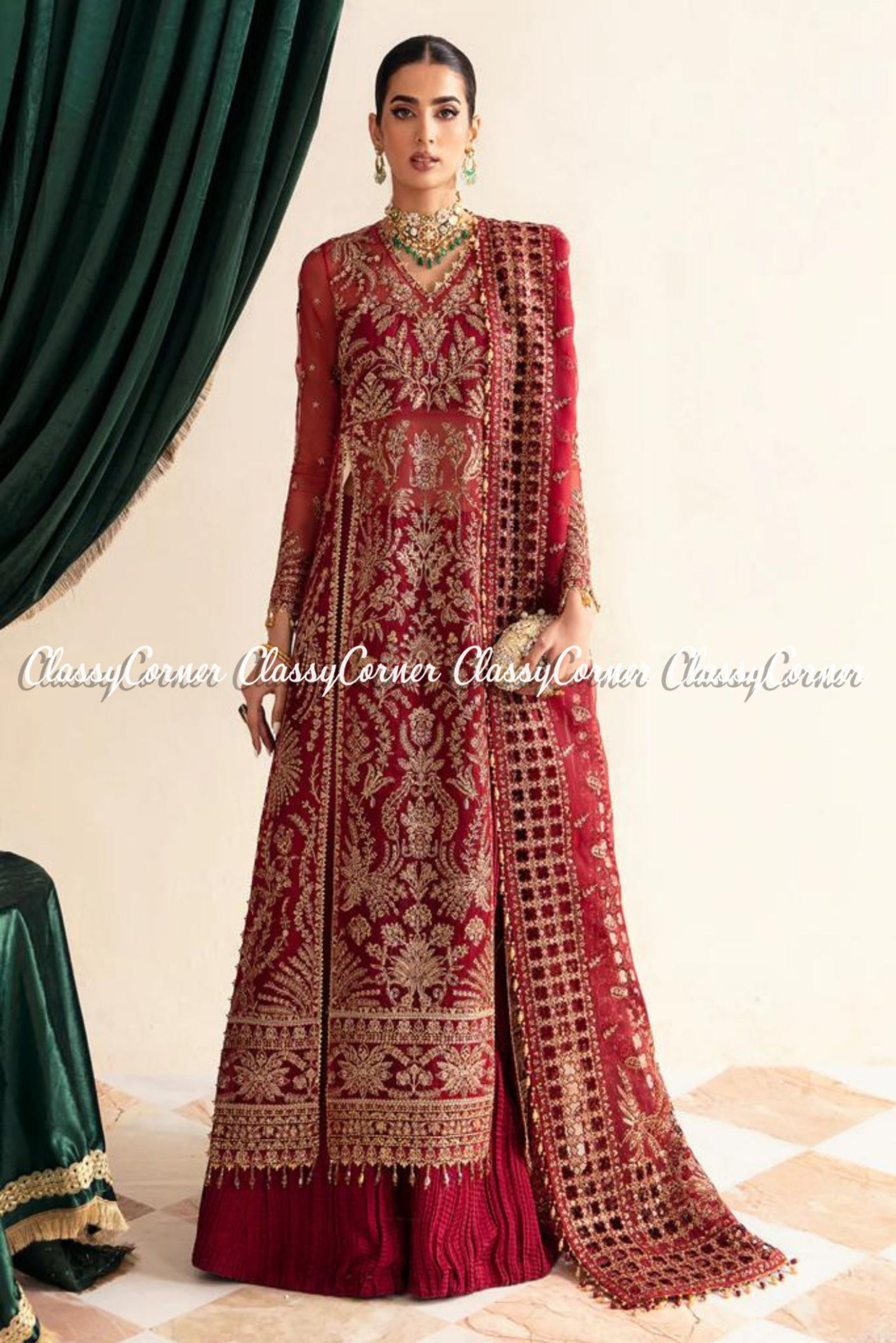 $139.99 AUD $154.99 AUDRed Golden Organza Embroidered Wedding Wear Sharara Dress