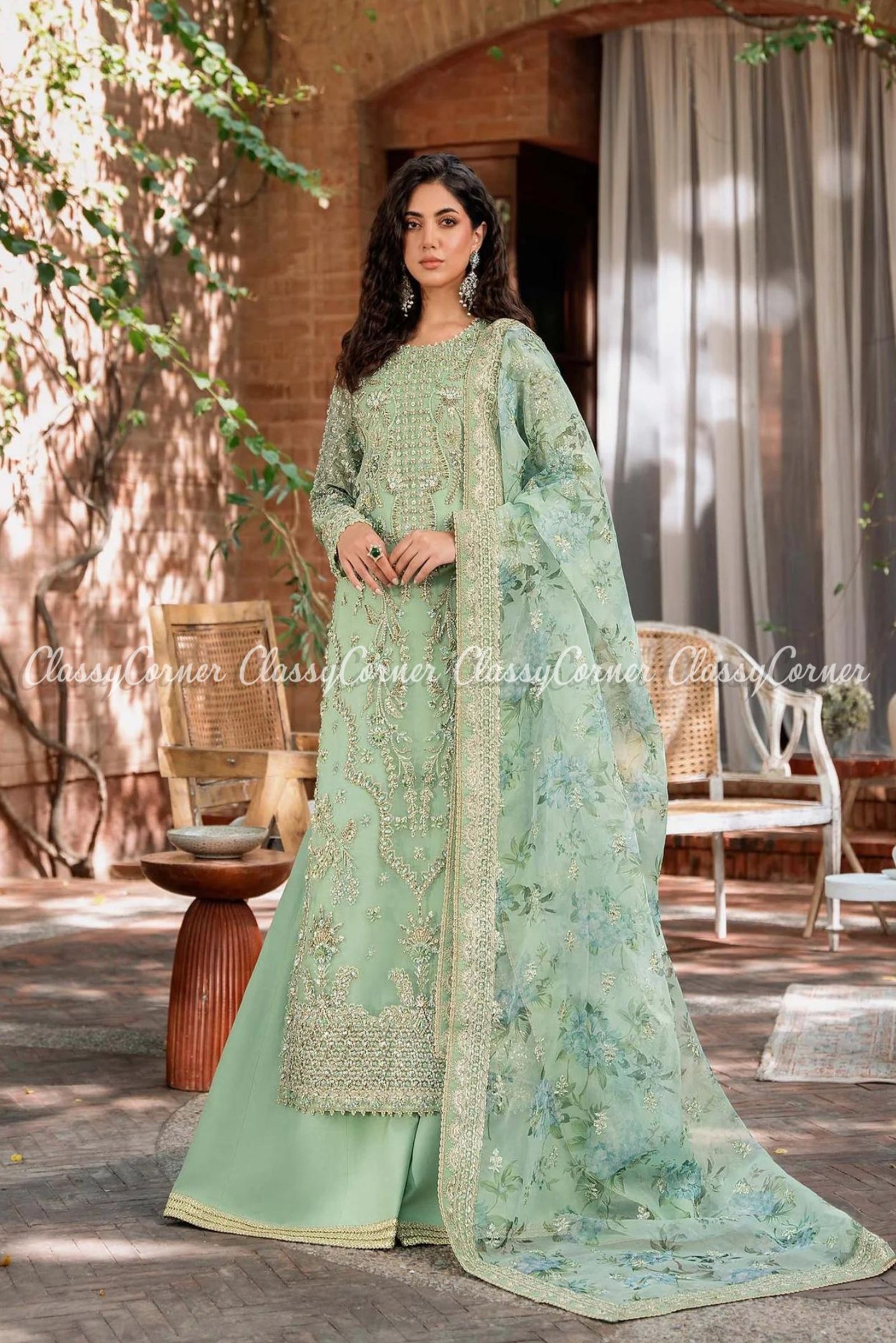 $589.99 AUDMint Green Organza Embroidered Party Wear Sharara Outfit