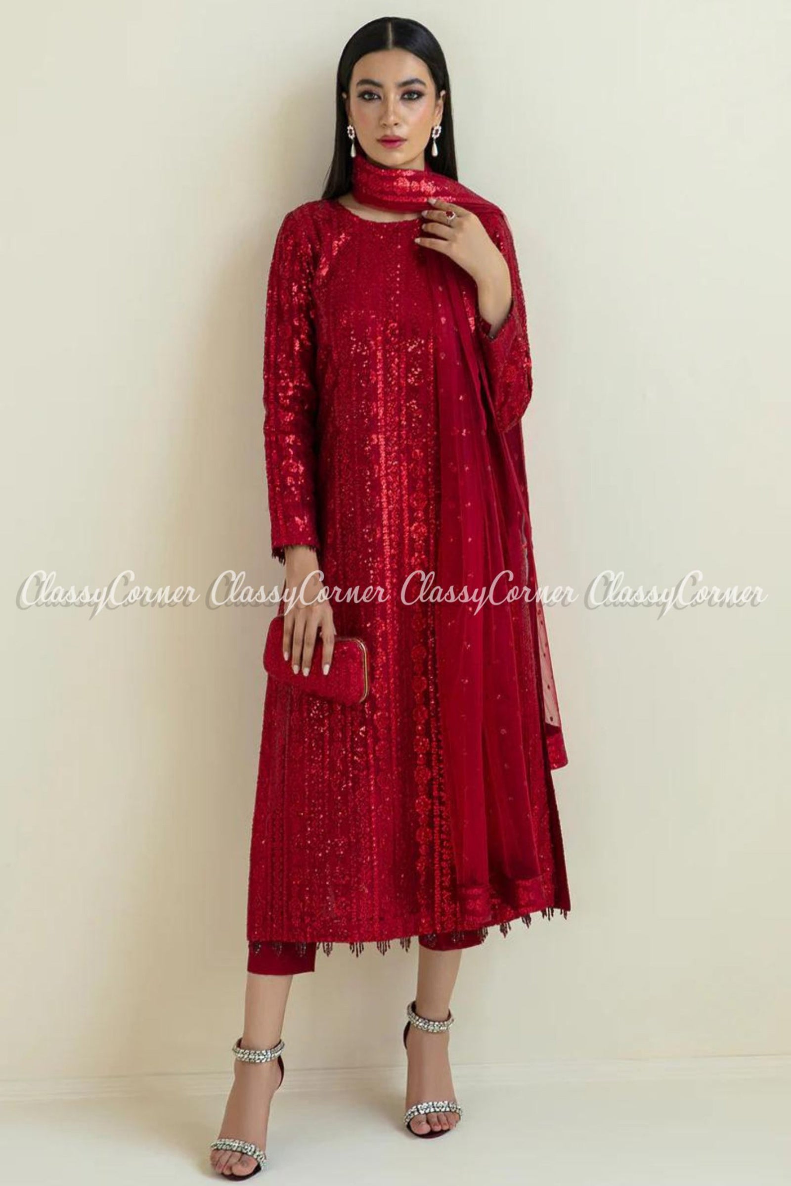 $279.99 AUD $399.99 AUDRed Net Embroidered Fancy Wear Salwar Kameez