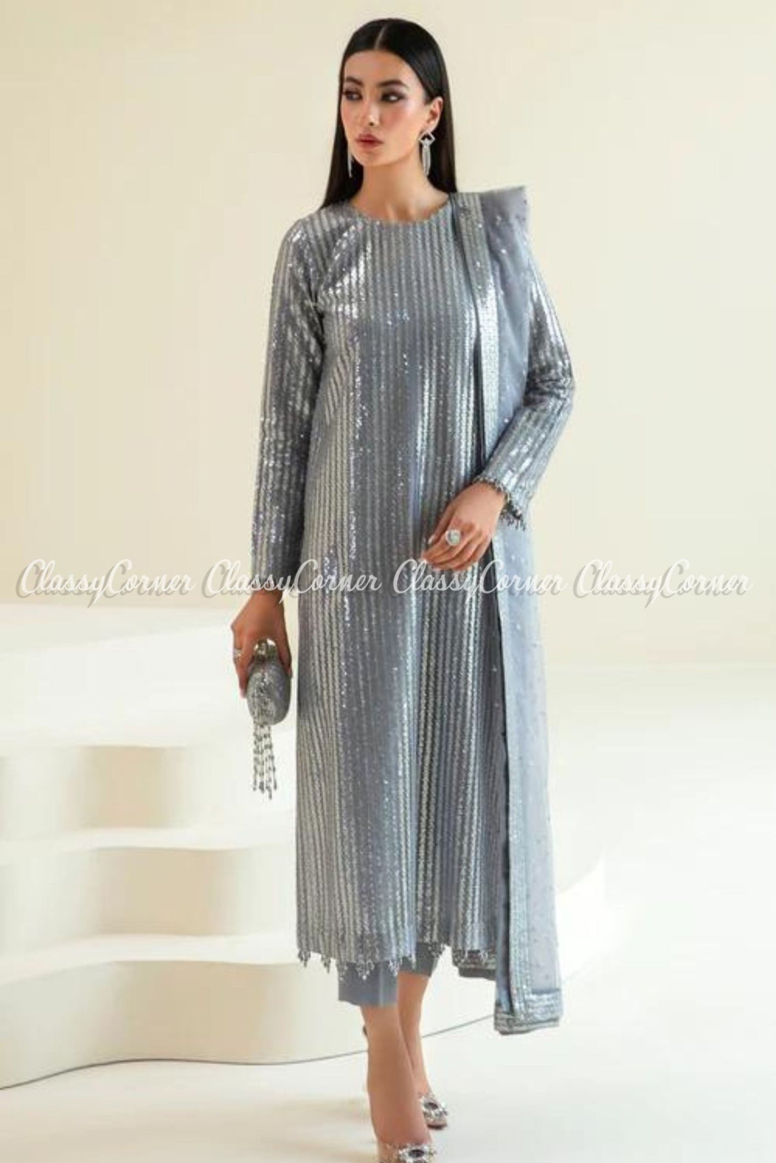 $279.99 AUDSilver Grey Net Embroidered Party Wear Salwar Kameez
