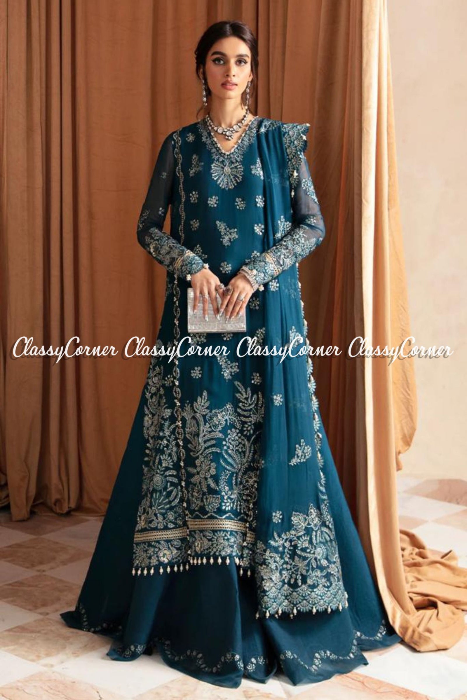 $244.99 AUD $259.99 AUDElegant Teal Blue Golden Chiffon Embroidered Sharara Outfit