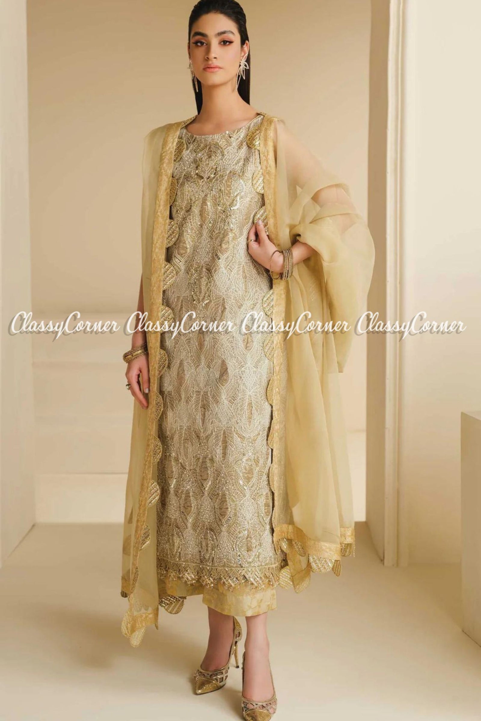 $429.99 AUDBeige Golden Organza Embroidered Pakistani Salwar kameez
