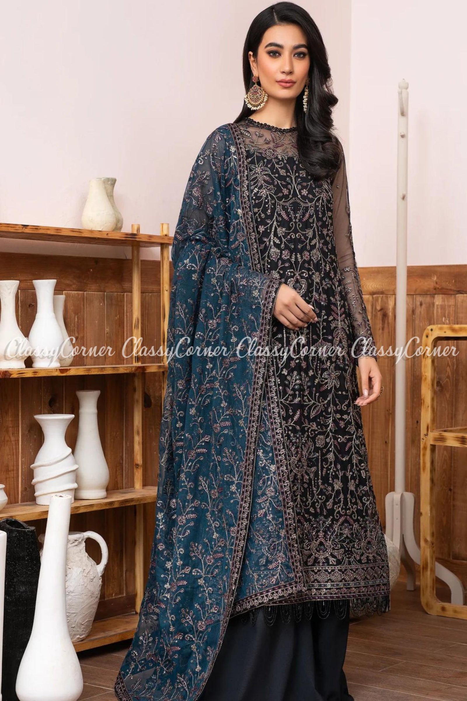 $299.99 AUDBlack Blue Net Embroidered Party Wear Sharara Dress