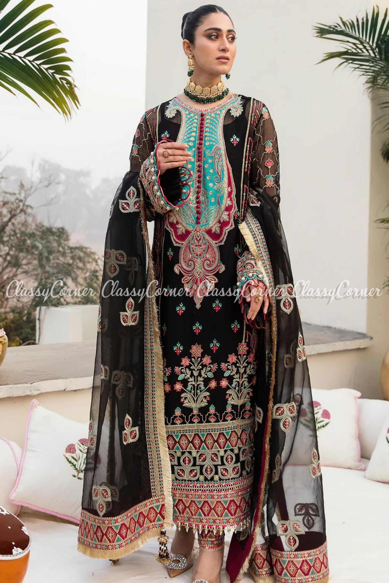 $384.99 AUDBlack Multicolor Chiffon Embroidered Party Wear Salwar Kameez