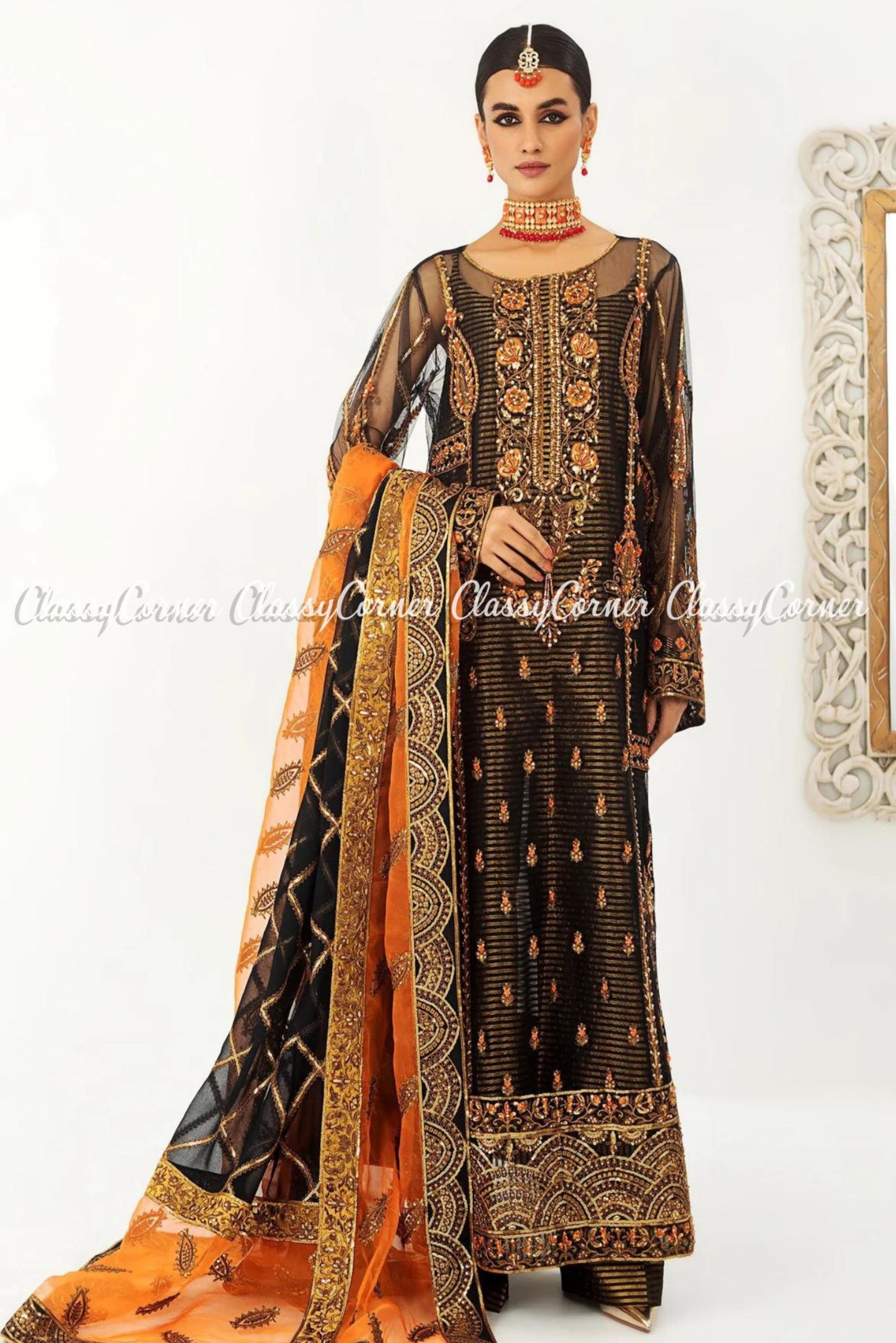 $529.99 AUDBlack Orange Net Embellished Party Wear Salwar Kameez