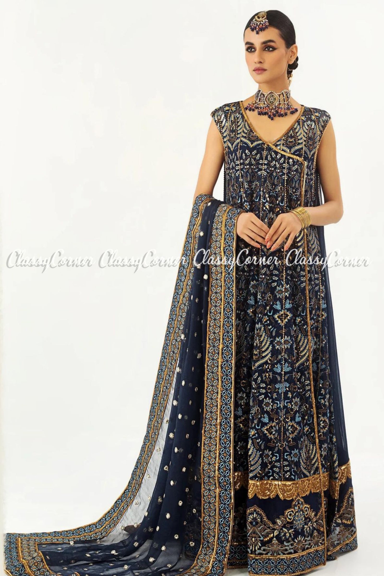 $279.99 AUDDark Blue Golden Net Organza Embroidered Wedding Wear Outfit