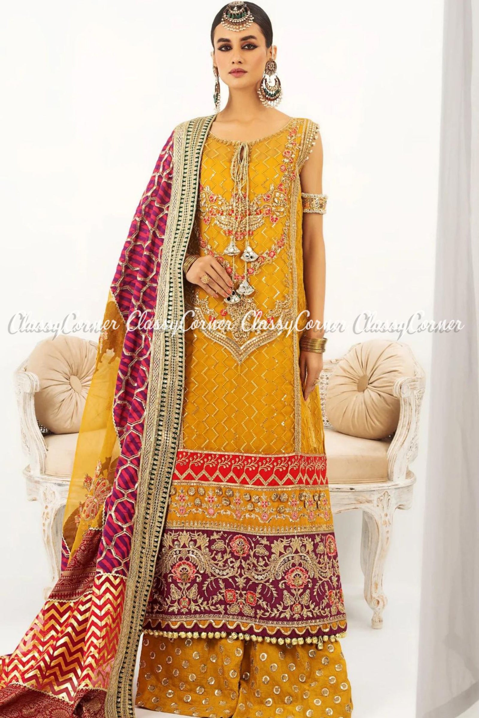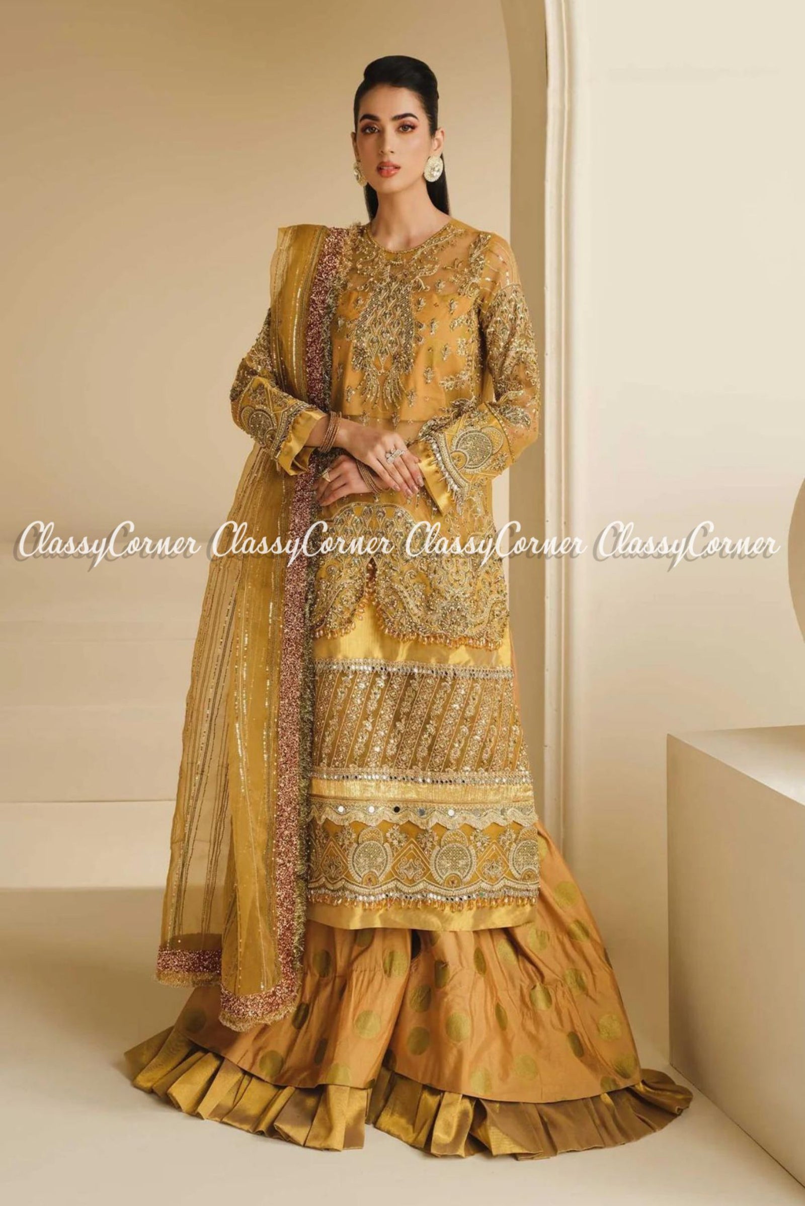 $464.99 AUDYellow Golden Organza Embroidered Pakistani Sharara Outfit