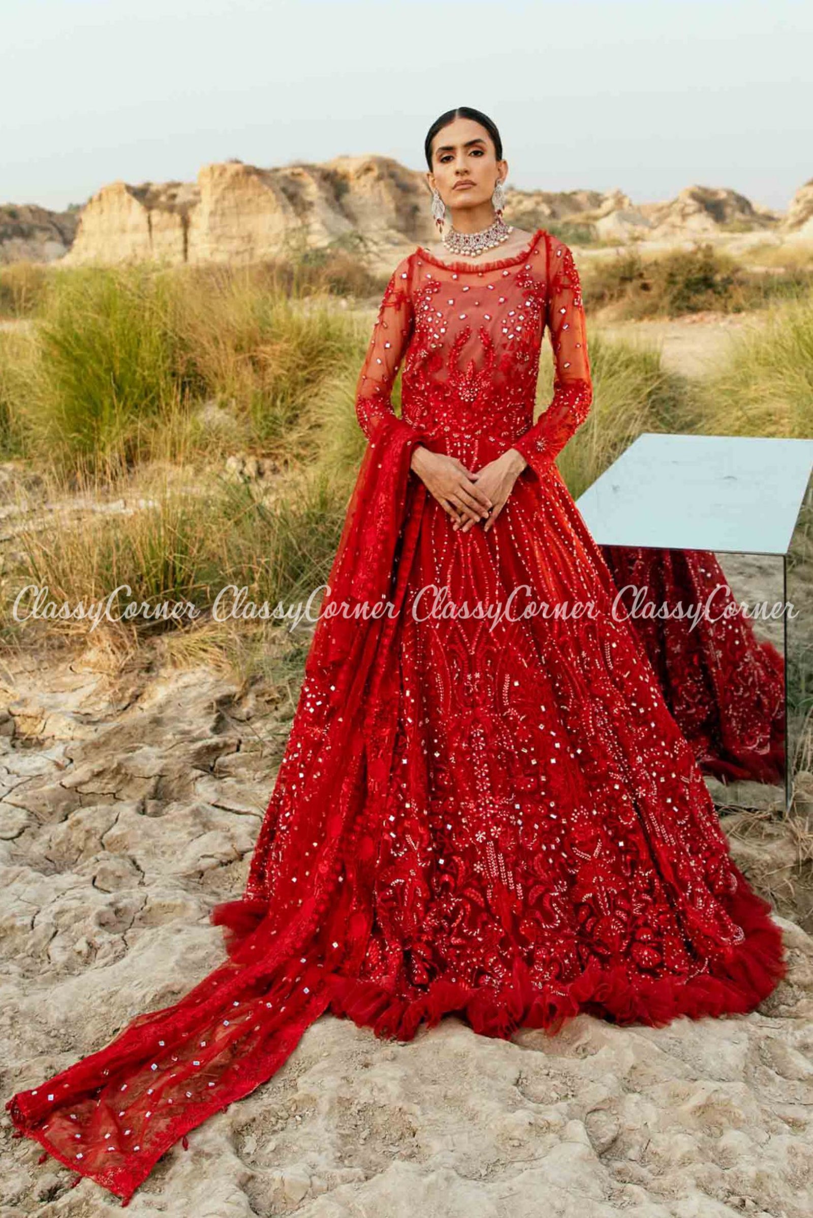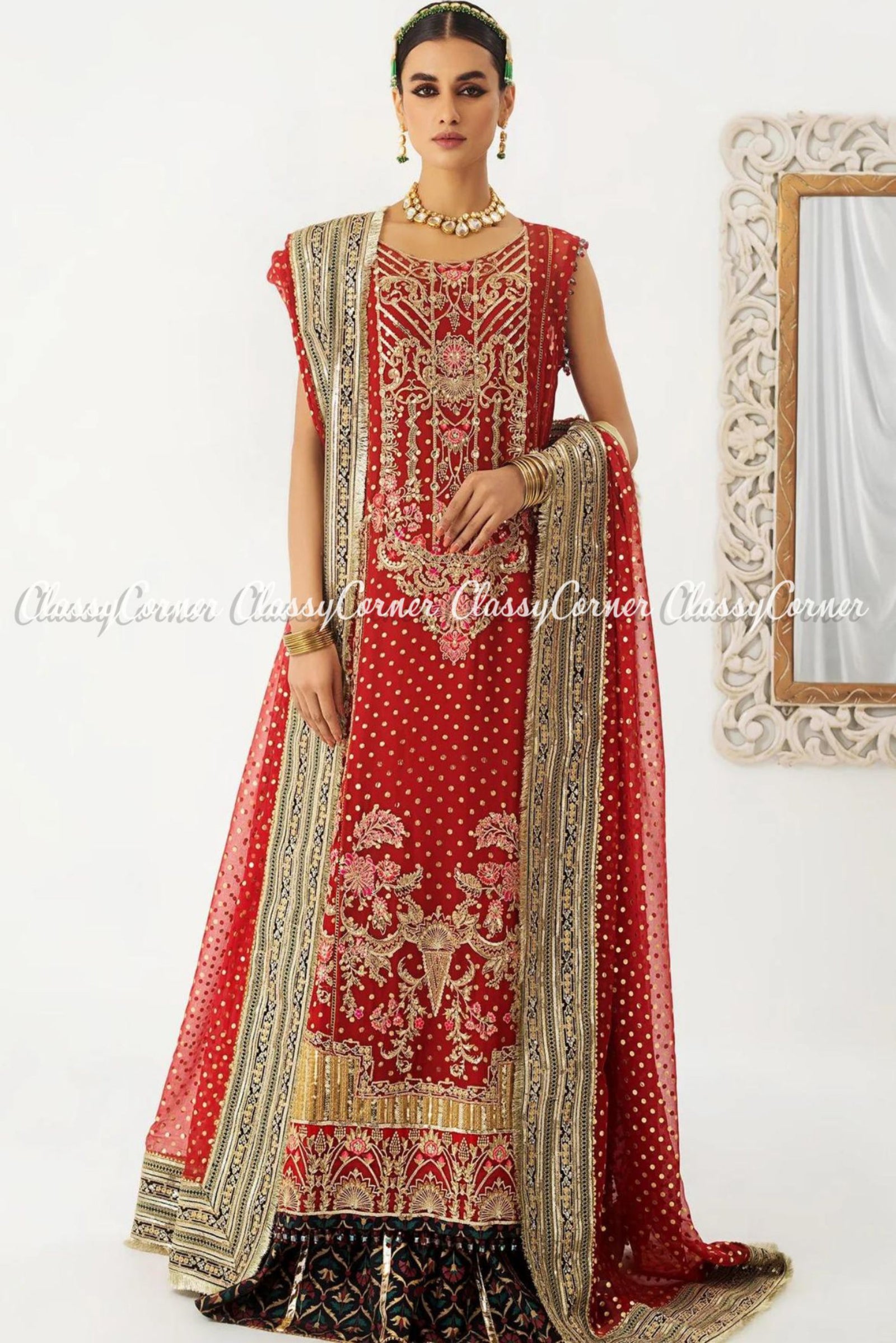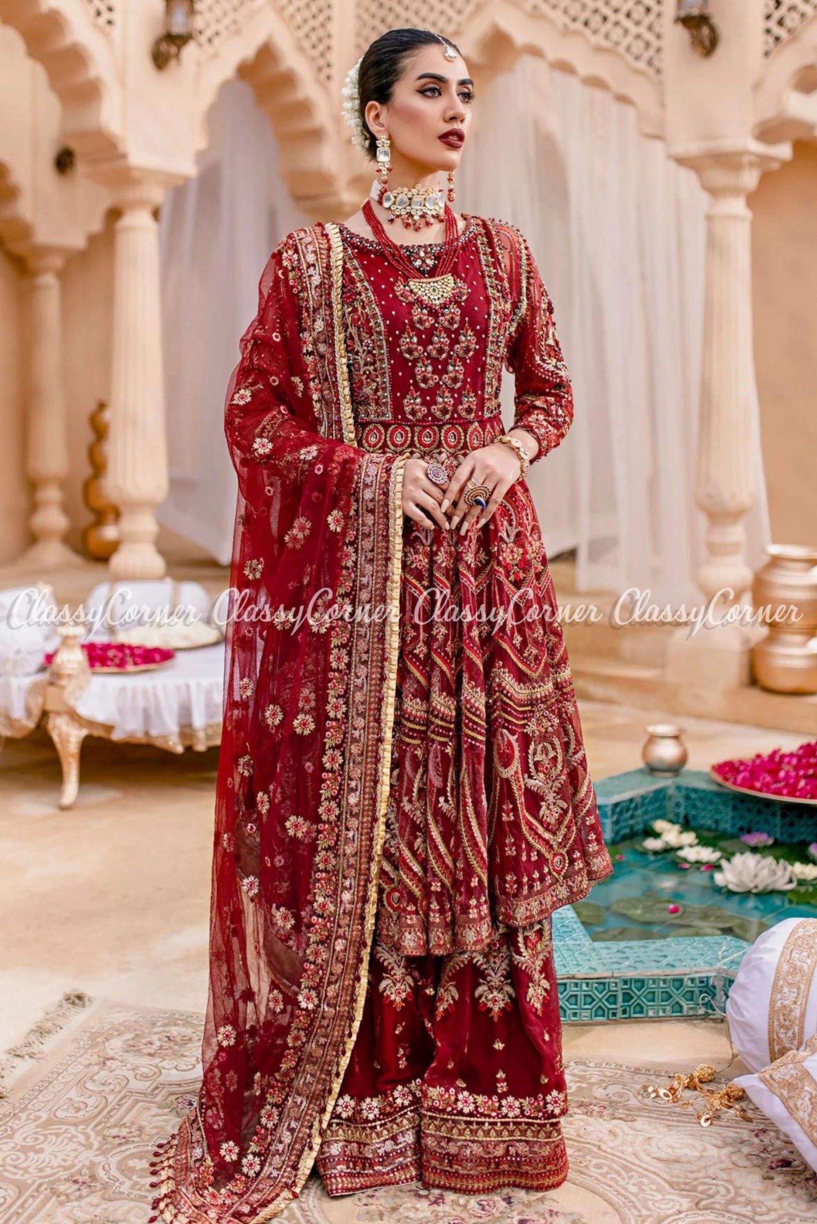 Maroon Red Net Embroidered Wedding Wear Gharara Dress