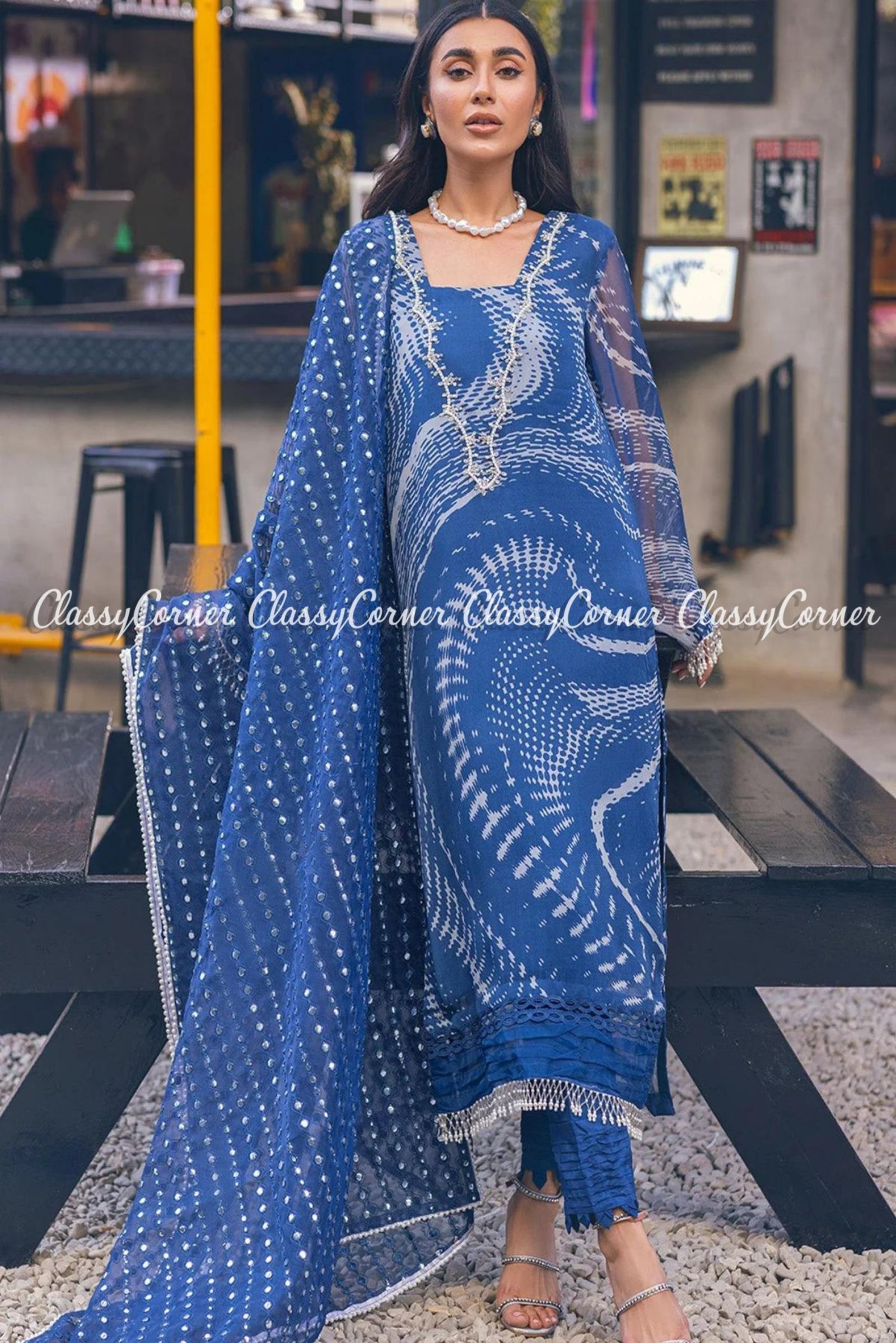 $174.99 AUDBlue White Chiffon Embroidered Formal Wear Salwar Kameez