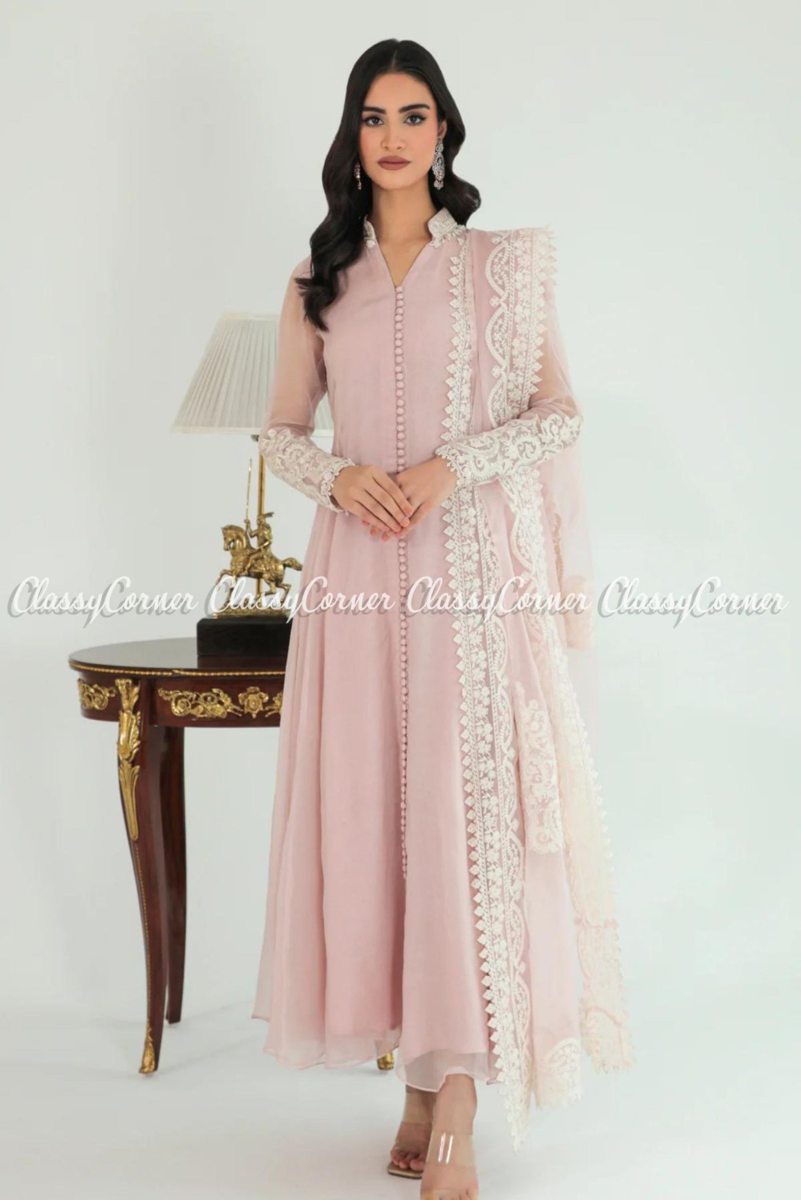 $279.99 AUD $339.99 AUDPakistani Light Pink White Chiffon Embroidered Frock Dress
