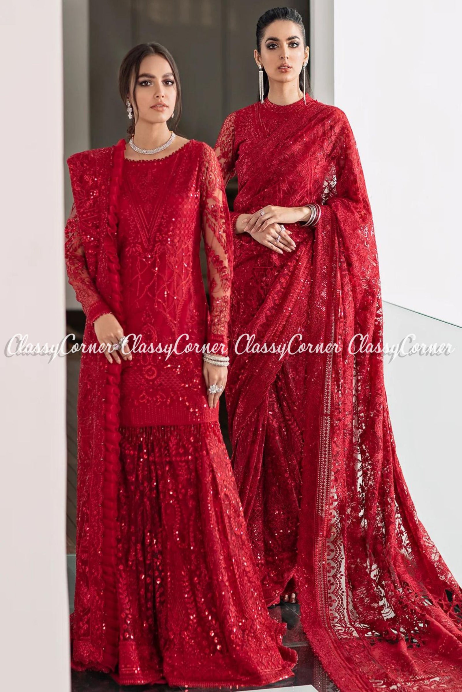 $534.99 AUDRed Net Embroidered Party Wear Sharara Saree Outfits