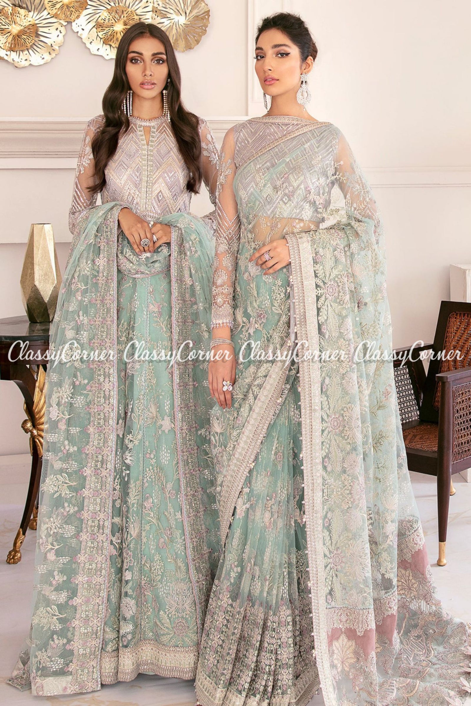 Pakistani Mint Green Golden Net Embroidered Gown Outfits