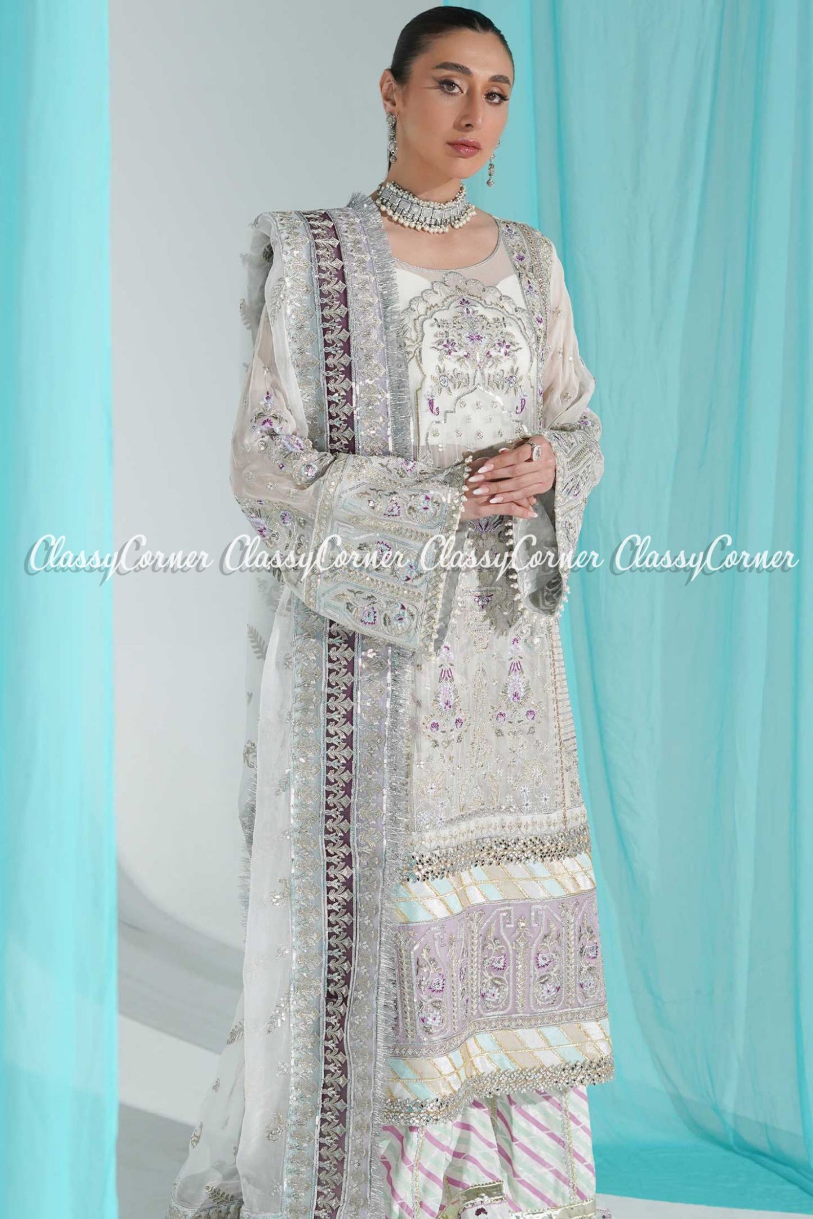 $159.99 AUDWhite Silver Chiffon Embroidered Wedding Wear Sharara Dress
